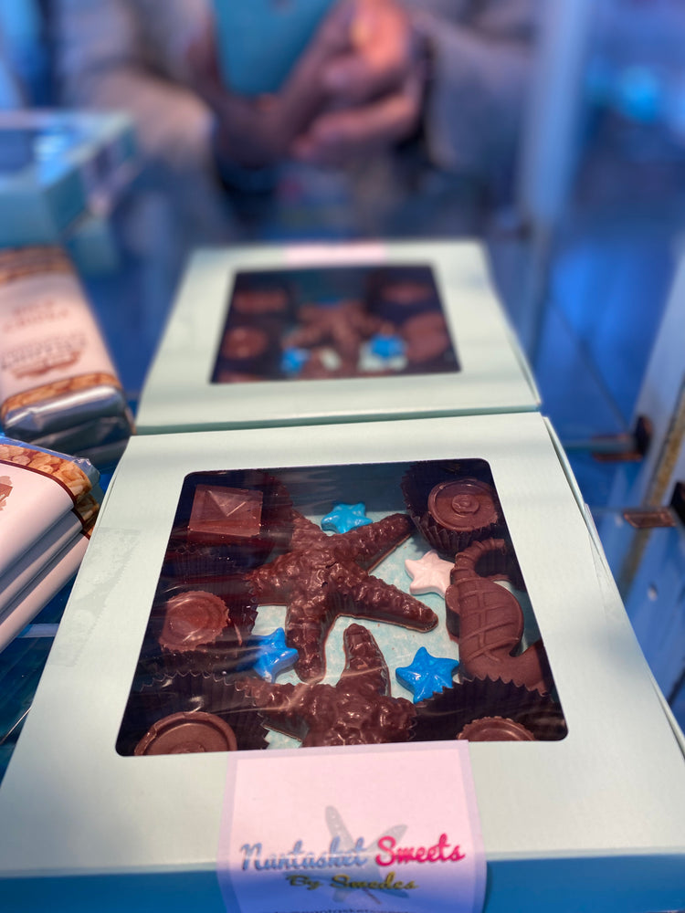 Chocolate gift box with assortment of Chocolate sea creatures.